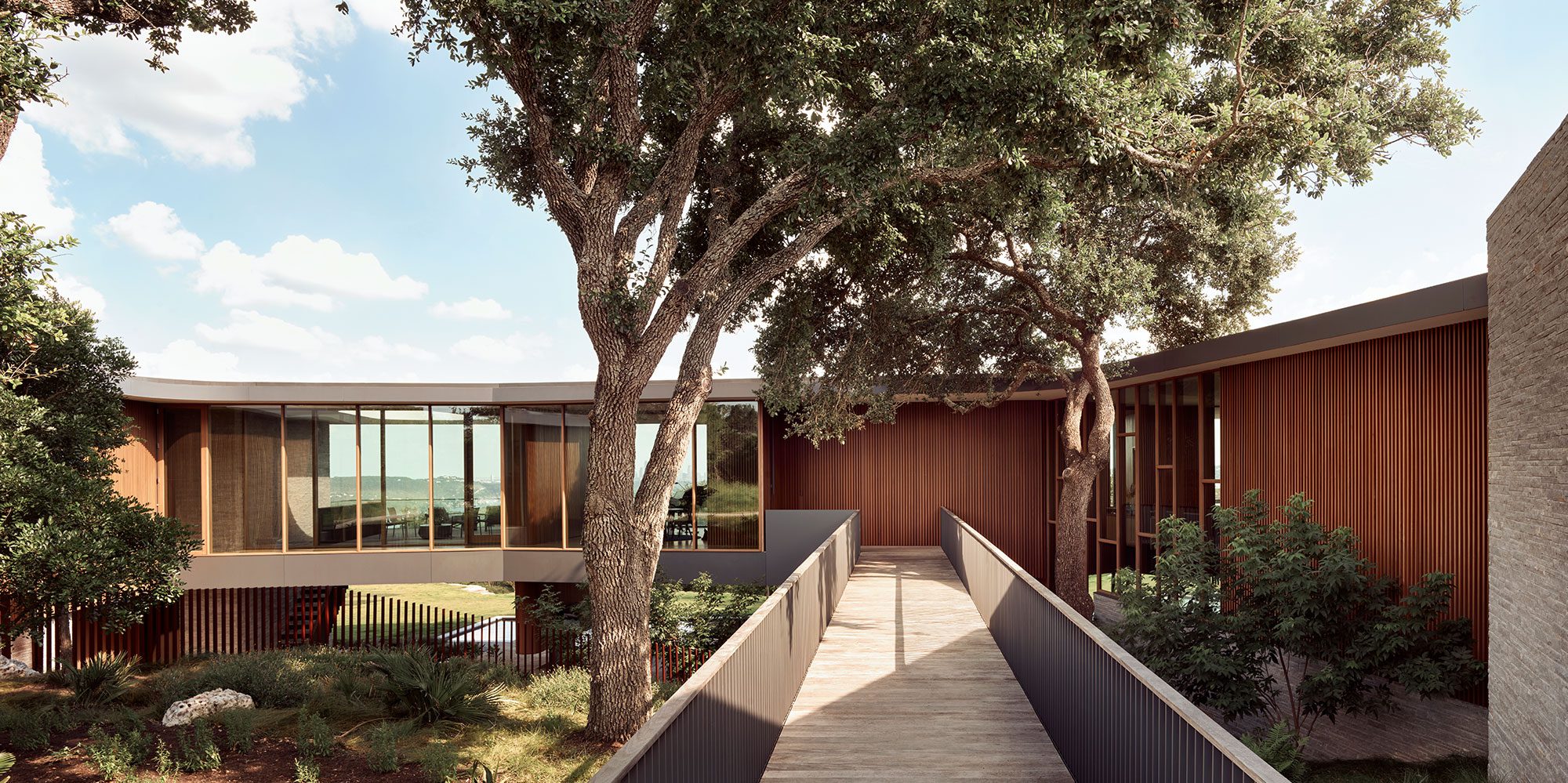 美國德州Austin一座聳起的山坡上,橡樹在清新的微風中低語,遠處都市的燈火在夜色中閃爍,一座宛如藝術品的居所靜靜佇立,像是周圍環境與生俱來的一部分,又像是在大自然中點綴上了一件充滿巧思的裝飾。