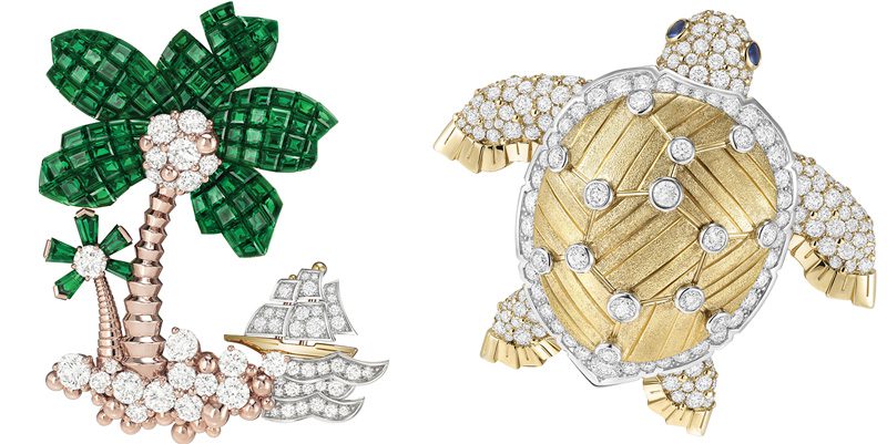 左:梵克雅寶「Treasure Island」系列的Palmier Mystérieux可轉換式胸針。右:梵克雅寶「Treasure Island」系列的Tortue de Cocos胸針。